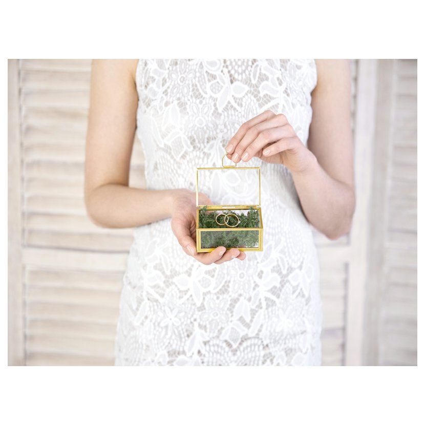 Box či dóza je vyrobena ze skla s kovovými okraji a uchem ve zlaté barvě. Vhodné na svatební prstýnky či uložení drobných věcí. Šířka je cca 9 cm, výška cca 5,5 cm, hloubka cca 4 cm.