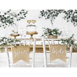 Závěsná dekorace na židle nebo na zeď z juty bílým nápisi Bride i Groom.