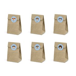 Papírový sáček z kraftového papírů se samolepky zvířátek: liška, jelen, mýval, bobr a sova .